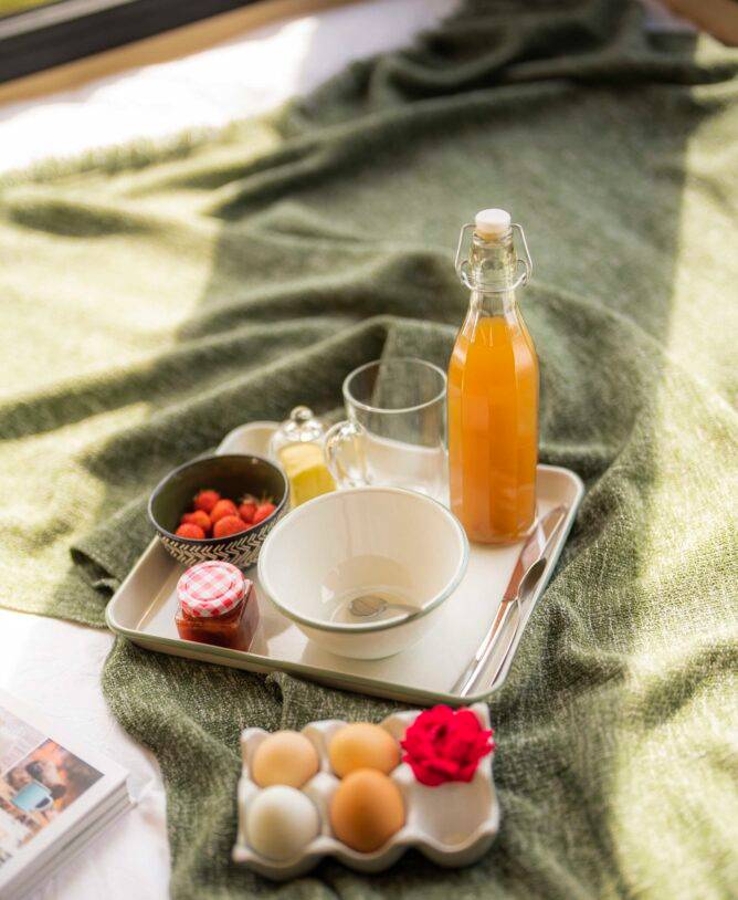 Verse eieren, melk, brood, zelfgemaakte jam, lokale boter, lokaal sap, yoghurt en biologische granola +.