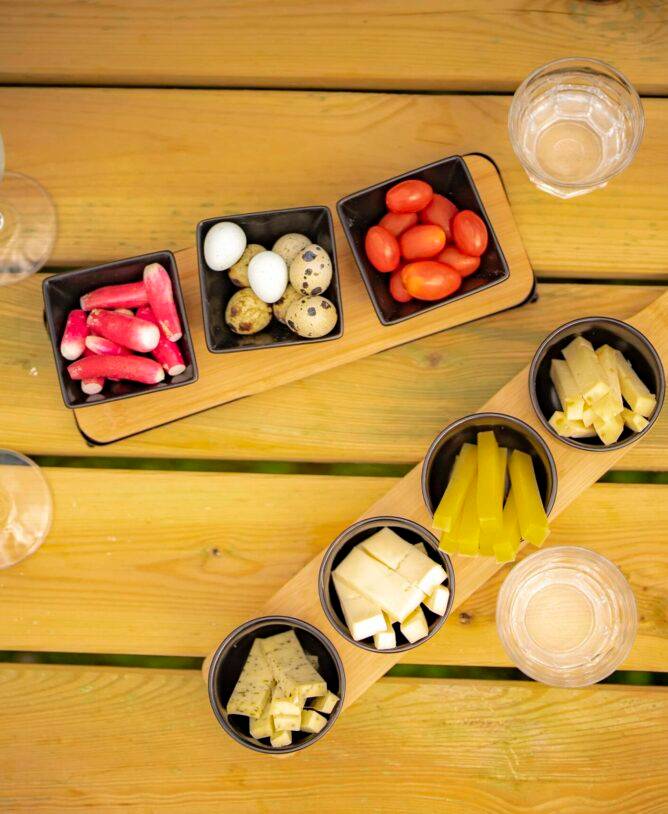 Comté, morbier, tomme met wilde knoflook en lokale fenegriek, hummus, groenten en huisgemaakte pickles